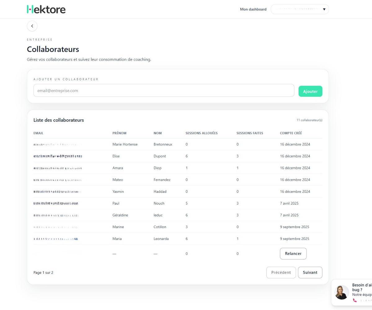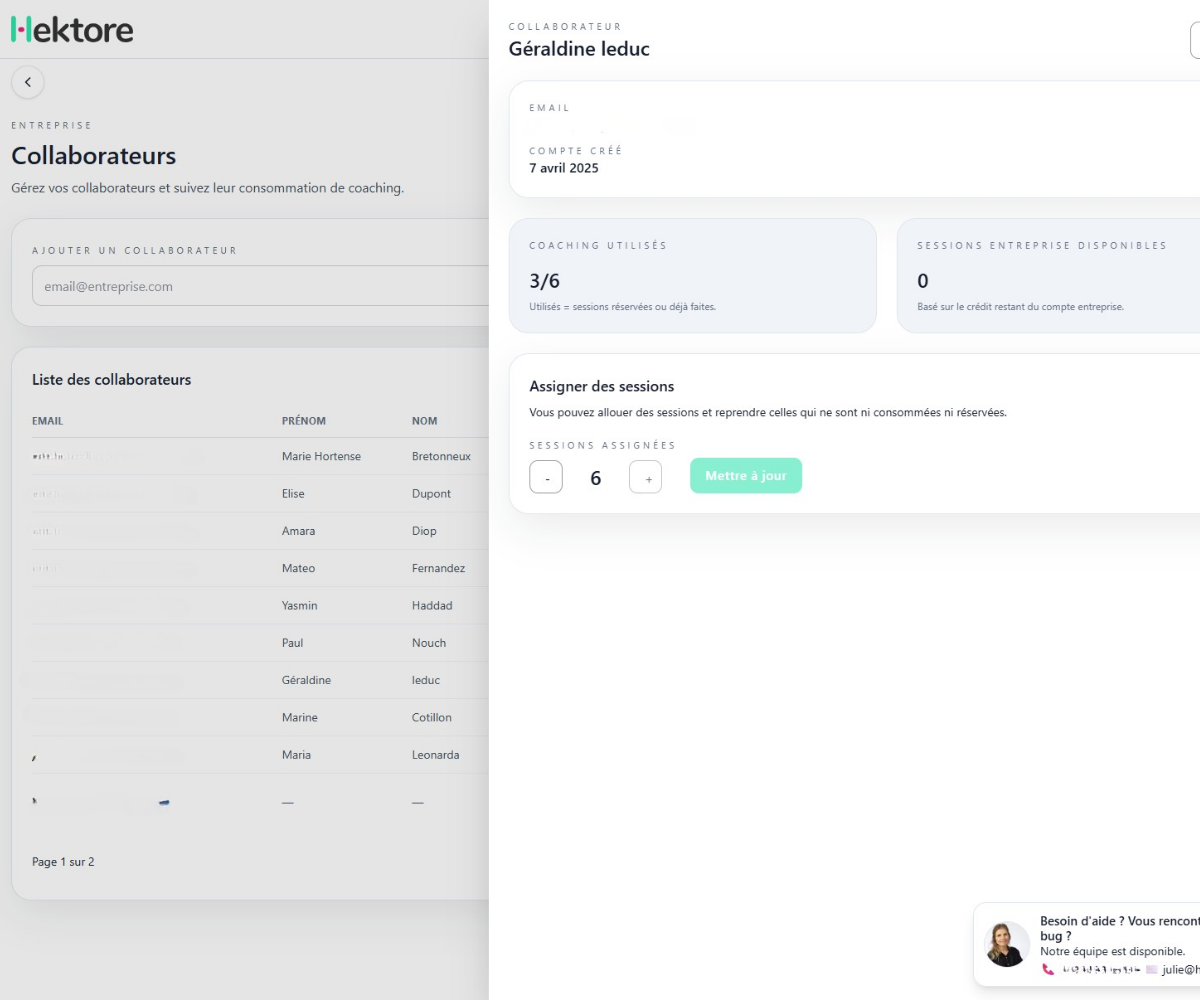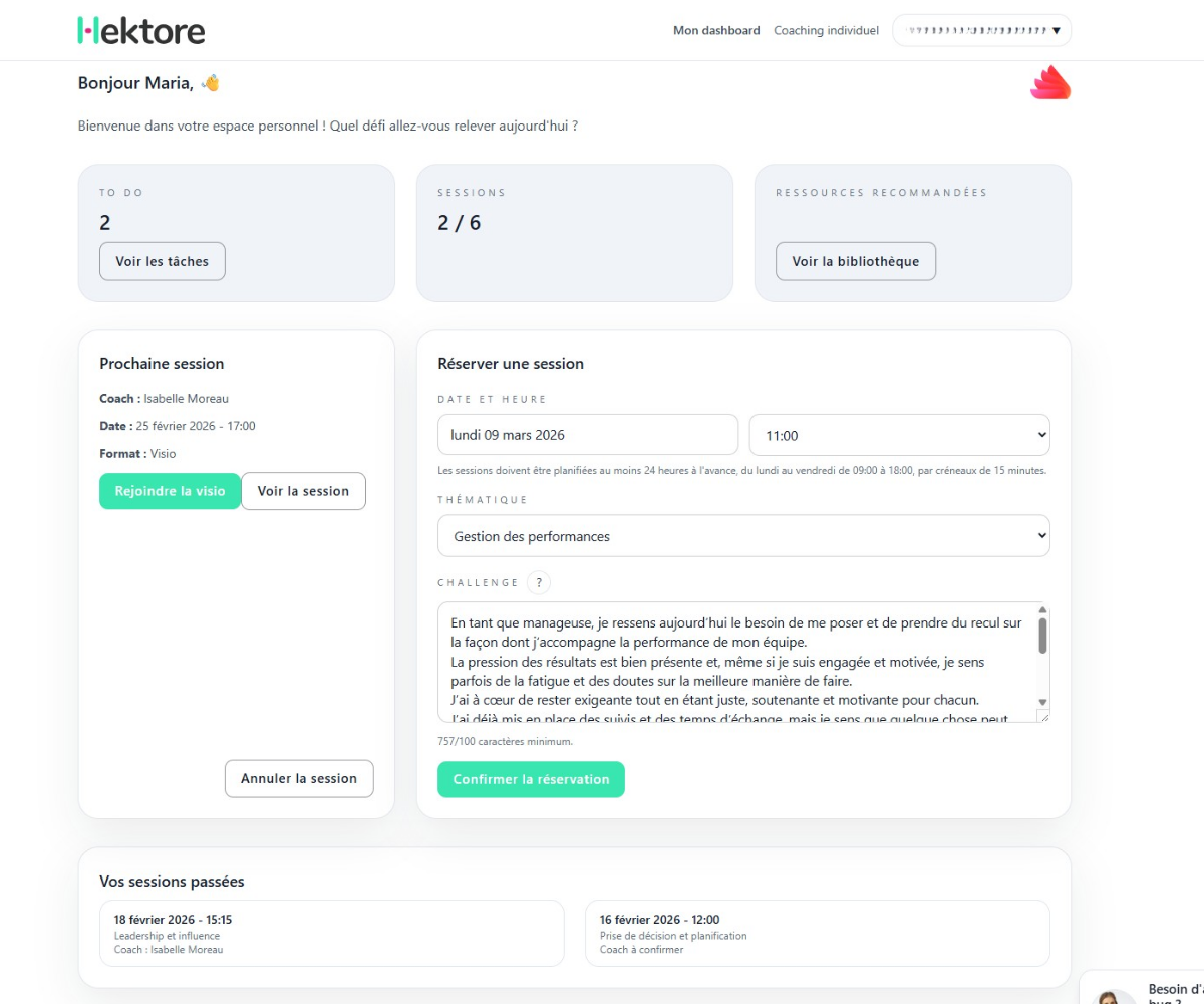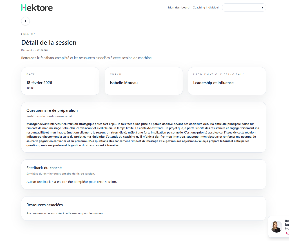 La session a lieu en visio, sous 24h sur Hektore. Vos collaborateurs se mettent en action dès la fin de la session.